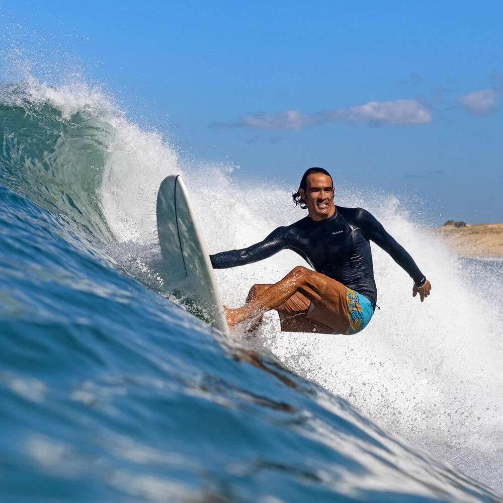 L'été, par temps chaud et avec la fraîcheur de l'eau, les surfeurs ont tendance à prolonger leur session de surf, sans adapter leur équipement. Les risques de coups de soleil sont donc multipliés. Le saviez-vous ? 10 à 15% des UV se réfléchissent sur l'eau, tandis que 40 à 95% pénètrent à 25 cm sous l'eau. C'est pourquoi le boardshort associé à une protection solaire (top UV,...) devient l'équipement incontournable de la pratique en eau chaude. Découvrez notre gamme de protection solaire !