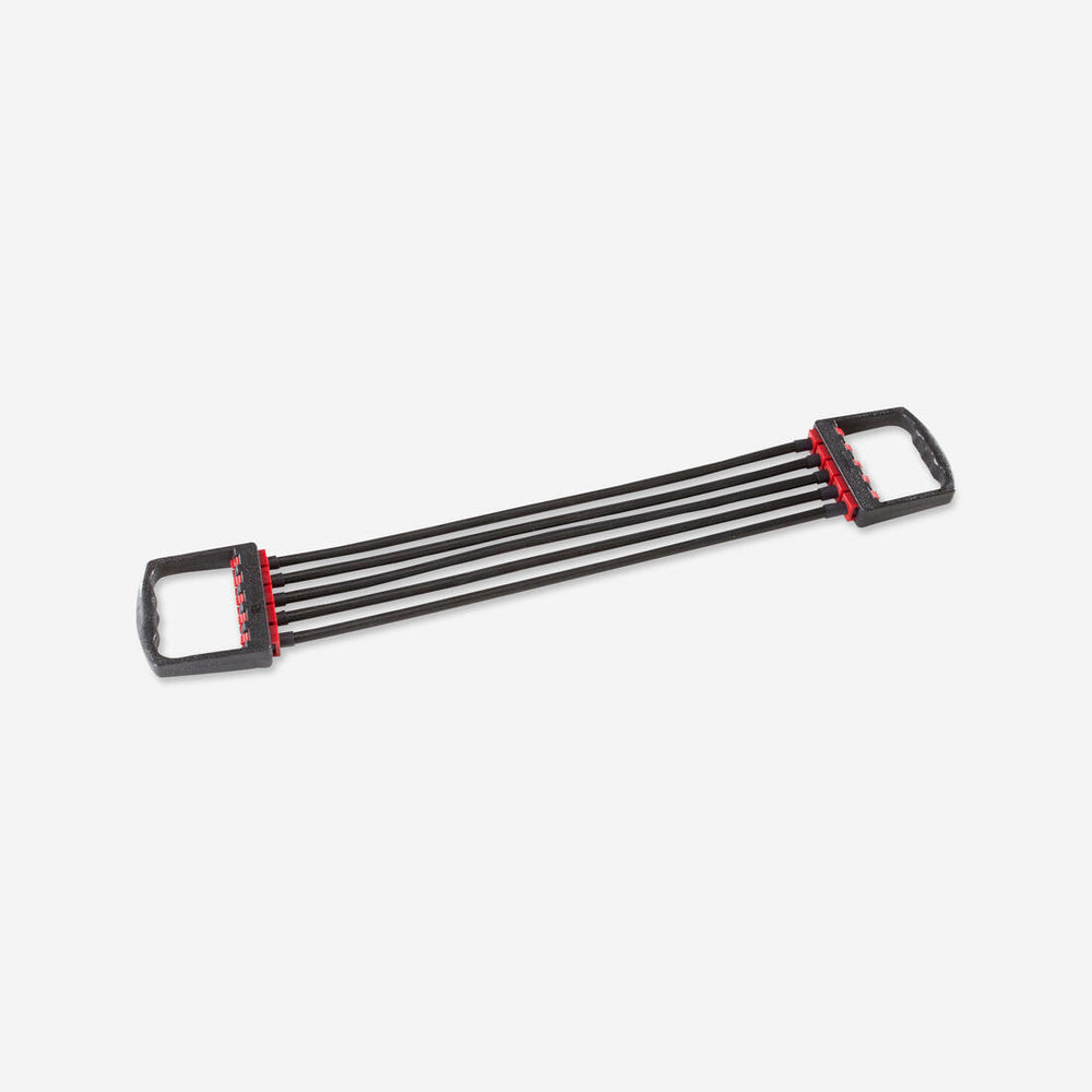 L'expander est évolutif : vous pouvez choisir la résistance en fonction de votre niveau ou de l’exercice. Si vous débutez, les 5 élastiques risquent d’être trop difficiles à tirer pour réaliser une parfaite exécution de mouvement. Commencez par 1 ou 2 élastiques puis augmentez progressivement.
