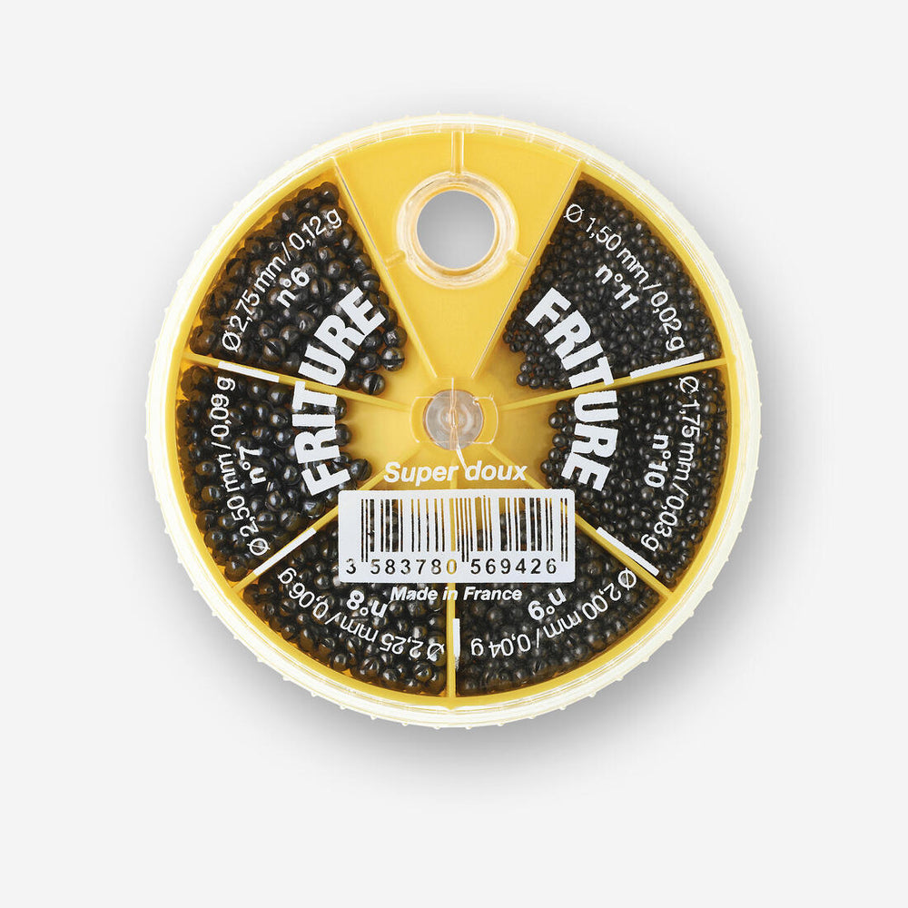 - 100% plomb - boite en plastique Modèle FIN / friture, tailles des plombs : n°11 0,02g ; n°10 0,03g ; n°9 0,04g ; n°8 0,06g ; n°7 0,09g ; n°6 0,12g ; Modèle MOYEN : n°9 0,04g ; n°8 0,06g ; n°7 0,09g ; n°6 0,12g ; n°5 0,14g ; n°4 0,18g Modèle GROS / truite: n°3 0,24g ; n°2 0,28g ; n°1 0,36g ; n°0 0,48g ; n°2/0 0,70g ; n°3/0 0,77g