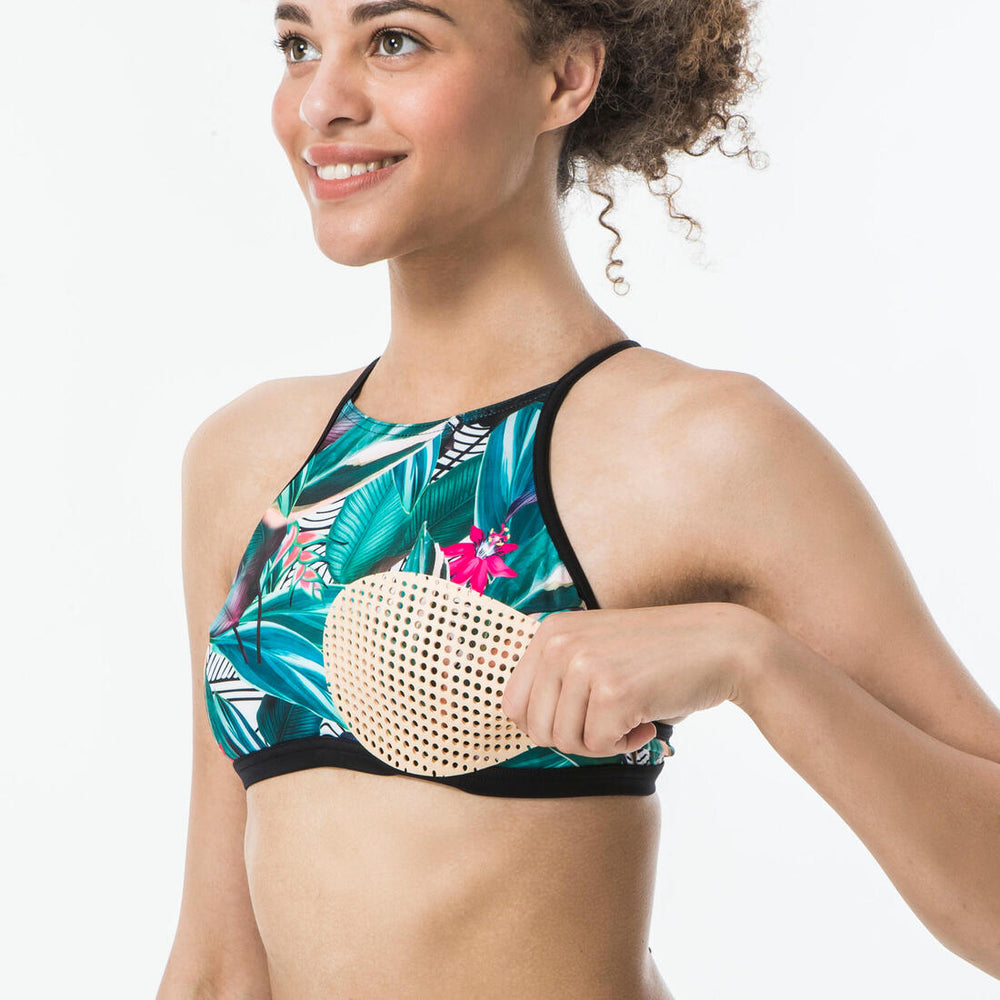 Avec son allure très sport, la brassière ANDREA couvre complètement la poitrine et joue avec les imprimés. Les épaules sont bien dégagées, parfait pour la pratique du surf ou du stand up paddle. Le dos quant à lui est totalement ouvert, de fines bretelles croisées et réglables permettent une bonne stabilité de la brassière dans les mouvements. La poitrine est bien contenue mais le maintien est modéré, cette brassière convient mieux aux petites poitrines. Contient des coques amovibles.