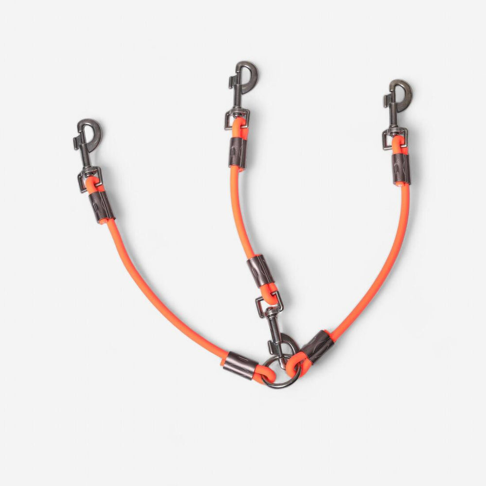 Cet accouple 900 modulable orange fluo est en matière PVC. Il pése 305 grammes en version 3 chiens et 190 grammes en version 2 chiens.