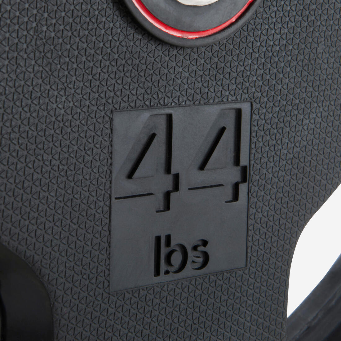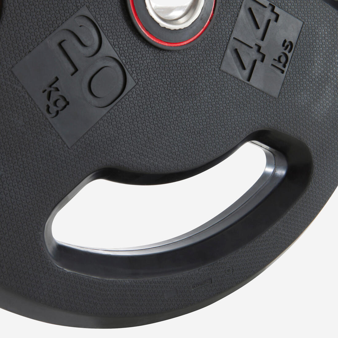 Poids en fonte recouvert de caoutchouc 20kg : - Épaisseur : 45mm - Diamètre intérieur : 28mm - Diamètre extérieur : 394mm